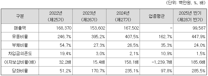 동사의 2023년 연결 기준 부채비율은 전년 대비 큰 폭으로 하락했으며, 현재까지 양호한 재무건전성을 유지하고 있습니다. 2 2025년도 반기 기준 현재 동종 업종 평균 대비해서도 안정적인 부채비율을 유지하고 있으며, 연결 기준 차입금 의존도는 1.5%입니다.