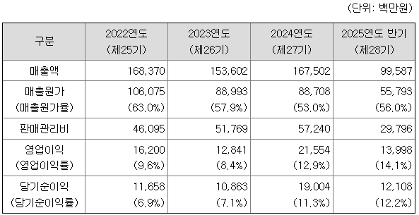 세나테크놀로지의 매출원가율은 2022년 63.0%에서 2024년 53.0%으로 지속적으로 하락하였으며, 2025년 반기 기준 56.0%로 소폭 상승했으나, 최근 3개년은 안정적인 우하향 기조를 유지하고 있습니다. 2023년부터 지속적으로 노력해 온 원가절감 및 환율효과로 인하여 이익률 상승이 크게 나타났기 때문입니다. 영업이익률의 경우 2022년 9.6%에서 2024년 12.9%로 상승했으며, 2025년 반기 기준 14.1%를 기록하면서 수익성이 개선되는 흐름이 지속되고 있습니다.