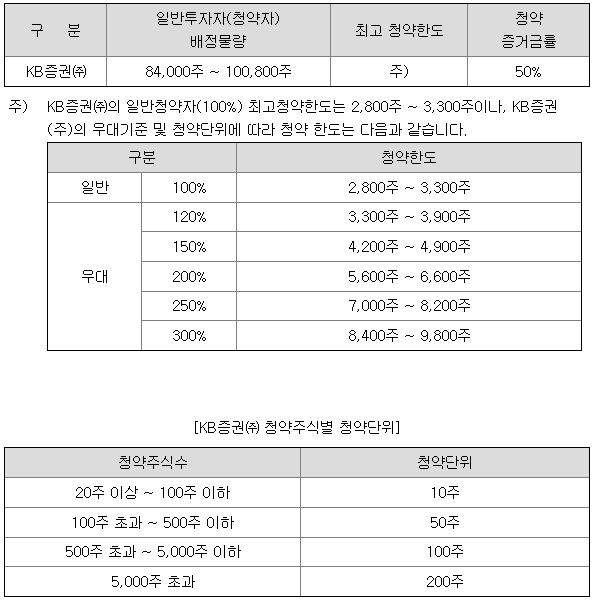 KB 증권의 일반 청약자 배정 물량은 84,000주 ~ 100,800주이고, 일반 청약자의 최고 청약 한도는 일반 고객 기준 2,800주 ~ 3,300주입니다.
