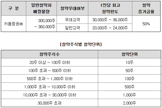 키움증권의 일반 청약자 배정 물량은 300,000주 ~ 360,000주이고, 일반 청약자의 최고 청약 한도는 일반고객 기준 20,000주 ~ 24,000주입니다.