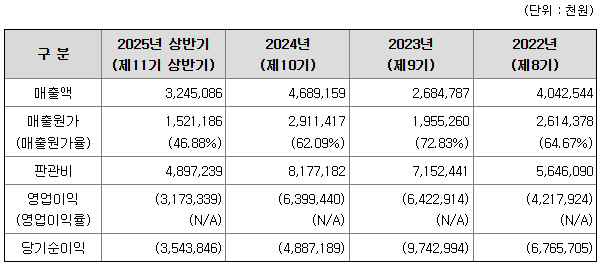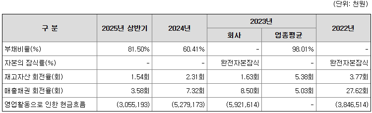 동사는 지속적인 연구개발 활동으로 인한 연구개발비용, 매출처 확장을 위한 광고선전비 등 판관비 부담 증가 등의 영향으로 최근 3개년간 영업손실을 기록하였으며, K-IFRS 전환에 따른 상환전환우선주 전환권의 파생상품 부채 인식 등에 따라 2022년과 2023년 완전자본잠식 상태를 기록하였습니다. 하지만 2024년 상환전환우선주 등 파생상품의 보통주 전환을 통한 자본금 확대를 통해 자본잠식상태에서 탈피하였습니다. 또한, 상장 후 공모자금 유입을 통해 추가적인 자본잠식 가능성을 낮출 수 있을 것으로 판단하고 있습니다.