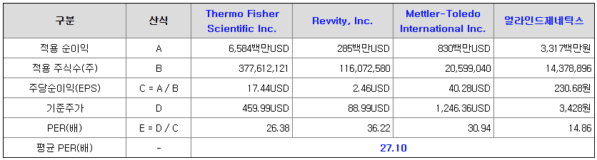 <유사회사의 평균 PER 배수 산정>