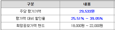 큐리오시스의 희망 공모가격은 회사의 주당 평가가액 29,533원에서 25.51% ~ 39.05% 할인한 가격입니다.