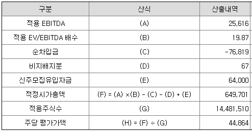 회사의 주당 평가가액은 2025년 반기 기준 EBITDA에 유사회사의 평균 EV/EBITDA배수를 곱한 후, 순차입금을 차감하여 회사가치를 구하고, 이를 주식 수로 나누어 산출한 것입니다.