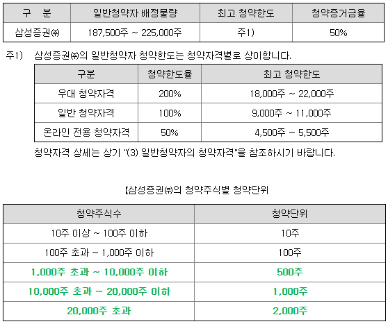 삼성증권의 일반 청약자 배정 물량은 187,500주 ~ 225,000주이고, 일반 청약자의 최고 청약 한도는 온라인 전용 청약 자격 기준 4,500주 ~ 5,500주입니다.