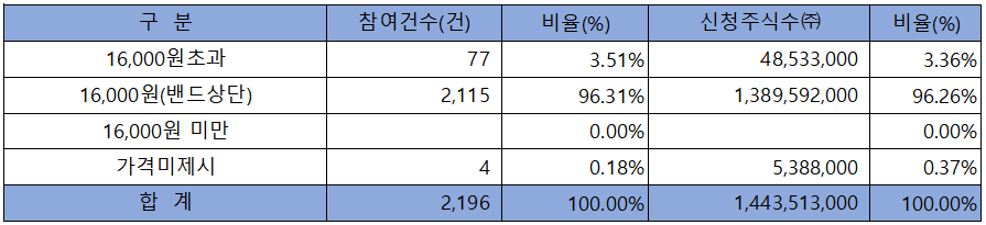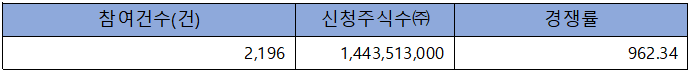 수요예측 참여 건수는 총 2,196건에 신청 주식수 1,443,513,000주로, 참여 경쟁률 962.34 : 1의 실적을 기록했습니다.