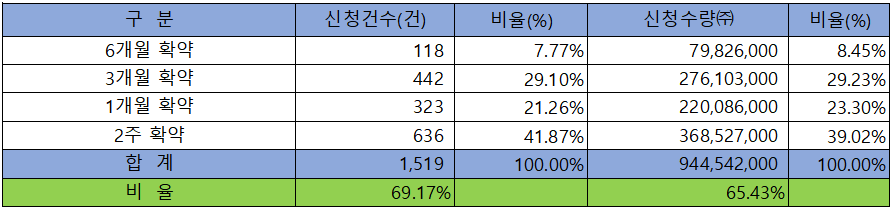 의무 보유 확약 건수는 1,519건에 944,542,000주로 전체 신청 물량 대비 건수로는 69.17%, 수량으로는 65.43%였으며, 2주 확약 비중이 제일 높았으나, 3개월 확약과 1개월 확약 신청도 꽤 있었습니다.