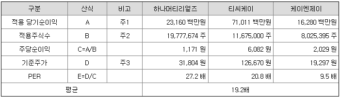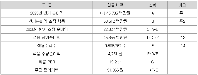 회사의 주당 평가가액은 2025년 직전 12개월의 조정순이익을 주식 수로 나누어 주당 순이익을 구하고, 여기에 유사회사의 평균 PER배수를 곱하여 산출한 것입니다.