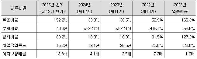 동사의 유동비율과 부채비율, 당좌비율은 2022년부터 2024년까지 업종평균 대비 열위에 있었으나 2025년 반기말 기준으로 개선된 상태입니다. 동사가 최근 3 사업연도 간 지속적으로 영업이익을 시현하였음에도 불구하고 2022년부터 2024년까지의 재무안정성 비율이 저조했던 것은 한국채택국제회계기준 도입 시 당사의 기발행 상환전환우선주 관련 계정이 자본이 아닌 부채로 분류되어 유동부채가 증가하고 자본이 감소한 것에 주로 기인합니다. 관련 부채는 2022년 약 67,952백만원, 2023년 116,198백만원, 2024년 114,487백만원이었으나, 당반기 중 동사의 기발행 상환전환우선주가 모두 보통주로 전환됨에 따라 관련 부채가 모두 자본으로 분류되어 유동부채가 감소하였고 자본이 증가하여 당반기말 주요 재무안정성 지표가 개선되었습니다