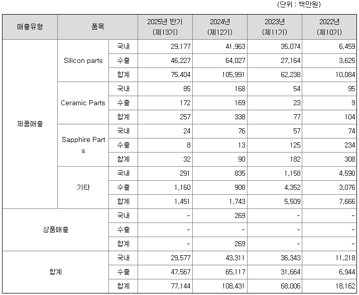 반도체의 집적도가 경쟁적으로 증가하면서 구성하는 단위 소자들 역시 더 작게 만들어야 하기 때문에 이를 구현하는 공정 기술이 매우 중요합니다. 동사의 제품군은 반도체 식각 공정에서 사용되는 실리콘 파츠, 사파이어 파츠 및 기타로 구성되어 있습니다.