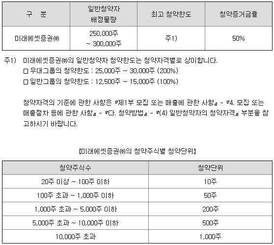 미래에셋증권의 일반 청약자 배정 물량은 250,000주 ~ 300,000주이고, 일반 청약자의 최고 청약 한도는 일반그룹 기준 12,500주 ~ 15,000주입니다.
