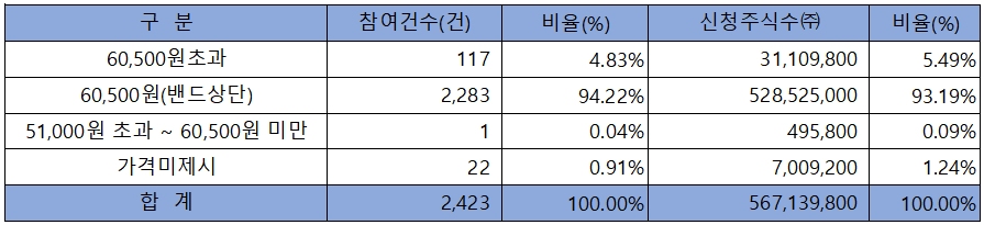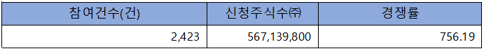 수요예측 참여 건수는 총 2,423건에 신청 주식수 567,139,800주로, 참여 경쟁률 756.19 : 1의 실적을 기록했습니다.