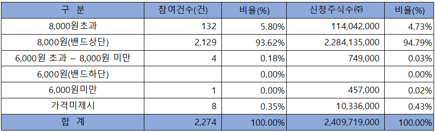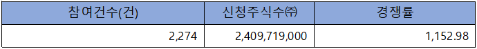 수요예측 참여 건수는 총 2,274건에 신청 주식수 2,409,719,000주로, 참여 경쟁률 1,152.98:1의 실적을 기록했습니다.