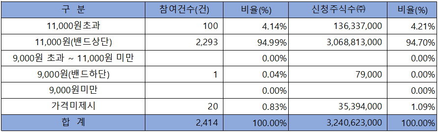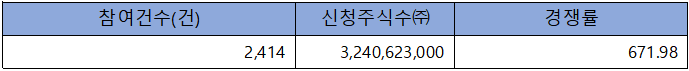 수요예측 참여 건수는 총 2,414건에 신청 주식수 3,240,623,000주로, 참여 경쟁률 671.98 : 1의 실적을 기록했습니다.