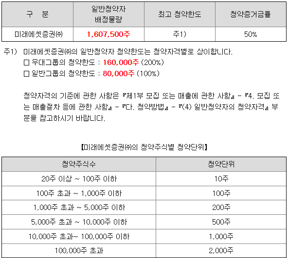미래에셋증권의 일반 청약자 배정 물량은 1,607,500주이고, 일반 청약자의 최고 청약 한도는 일반그룹 기준 80,000주입니다.