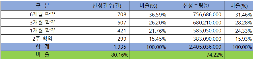 의무 보유 확약 건수는 1,935건에 2,405,036,000주로 전체 신청 물량 대비 건수로는 80.16%, 수량으로는 74.22%였으며, 6개월 확약 비중이 제일 높았고, 3개월 확약과 1개월 확약이 그 뒤를 이었습니다..
