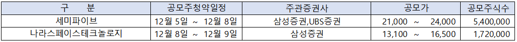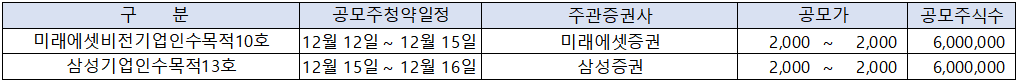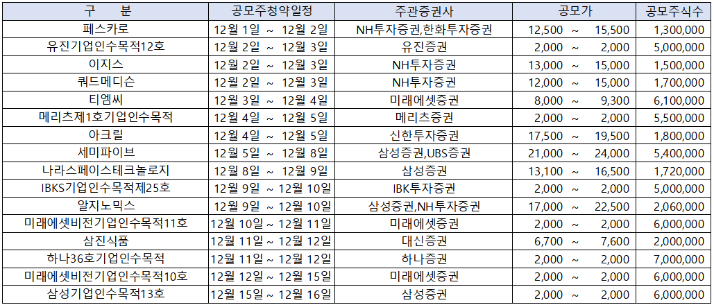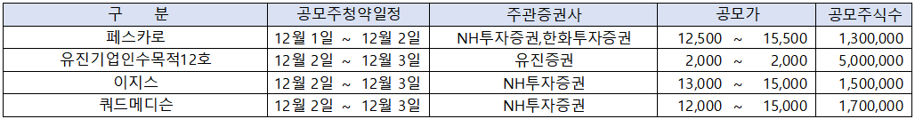 위 내용을 보면 12월 첫째주부터 시작해서 청약이 끝나는 셌째주 초반까지 많은 종목의 청약 일정이 중복되고 있음을 알 수 있습니다.