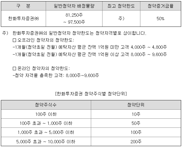 한화투자증권의 일반 청약자 배정 물량은 81,250주 ~ 97,500주이고, 일반 청약자의 최고 청약 한도는 8,000주 ~ 9,600주입니다.