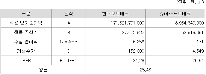 회사의 주당 평가가액은 2026년 추정 순이익을 할인하여 현재가치로 환사 한 후 주식 수로 나누어 주당 순이익을 구하고, 여기에 유사회사의 평균 PER 배수를 곱하여 산출한 것입니다.
