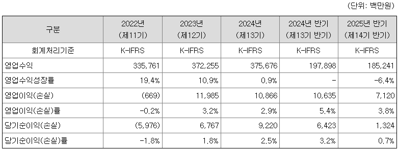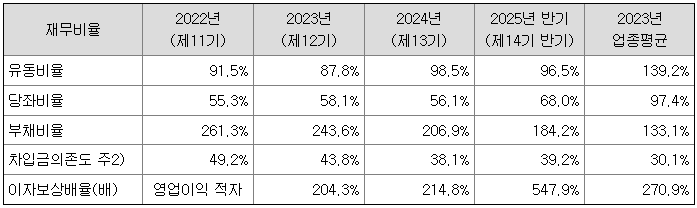 동사의 재무안정성 지표인 부채비율 및 차입금 의존도는 동종업계 평균 대비 높은 수준을 기록하였습니다. 2022년도 부채비율은 261.3%, 차입금의존도는 49.2%를 기록하였습니다. 2023년부터는 영업실적 개선에 따라 부채비율과 차입금의존도가 개선되는 모습이며 2025년 반기 기준 부채비율은 184.2%, 차입금의존도는 39.2%를 기록하였습니다.