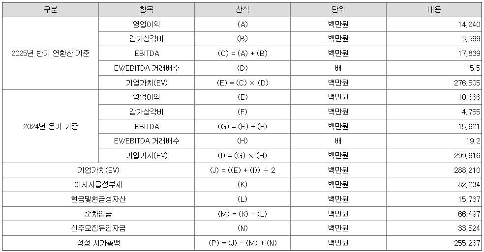 회사의 주당 평가가액은 2024년 온기 기준 EBITDA와 2025년 반기 기준 직전 12개월의 EBITDA를 평균한 수치에 유사회사의 EV/EBIRDA배수를 곱하여 회사가치를 정하고, 순차입금을 감안한 후 주식 수로 나누어 산출한 것이니다.