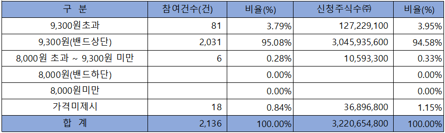 수요예측 참여 건수는 총 2,136건에 신청 주식수 3,220,654,800주로, 참여 경쟁률 959.96 : 1의 실적을 기록했습니다.