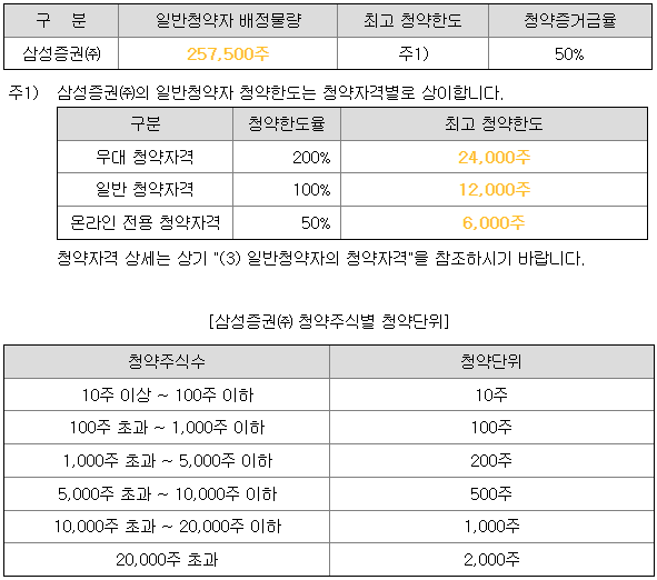 삼성증권의 일반 청약자 배정 물량은 257,500주이고, 일반 청약자의 최고 청약 한도는 온라인 전용 청약 자격 기준 6,000주입니다.