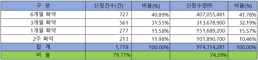 의무 보유 확약 건수는 1,778건에 974,314,281주로 전체 신청 물량 대비 건수로는 79.77%, 수량으로는 74.29%였으며, 6개월 확약 비중이 제일 높고, 그다음을 3개월 확약과 1개월 확약이 잇고 있습니다.