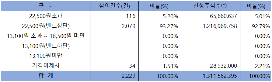 수요예측 참여 건수는 총 2,229건에 신청 주식수 1,311,562,395주로, 참여 경쟁률 848.91 :1의 실적을 기록했습니다.