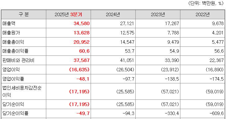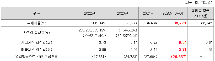 동사의 부채비율은 2022년 -115.14%, 2023년 -151.56%로 완전자본잠식 상태였으나, 2024년 34.48%, 2025년 3분기 38.77%로 개선되었습니다. 자본잠식률 또한 2022년 285,236,835.12%, 2023년 151,445.24%에서 2024년 이후 자본확충 등에 따라 개선 추세를 보이고 있습니다.