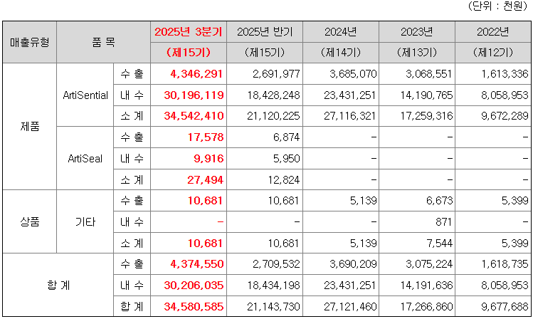 아울러 동사의 다관절 혈관봉합기 ArtiSeal 역시 주요 대표 제품입니다. 기존 상용화된 혈관봉합기 제품들은 관절 기능이 없는 일자형 수술 기구이거나 회전 각도가 제한적인 기술적 한계를 보유하고 있었습니다. 당사의 ArtiSeal은 ArtiSential과 동일한 엔드툴 기반 기술을 적용하여 90° 회전 각도를 구현할 수 있는 유일한 제품으로, 기존 제품의 한계를 극복하였습니다. 이러한 차별화된 성능을 바탕으로 ArtiSeal은 2023년 한국 식약처 허가를 시작으로 미국, 유럽, 일본 등 주요 국가의 인허가를 모두 획득하였습니다.