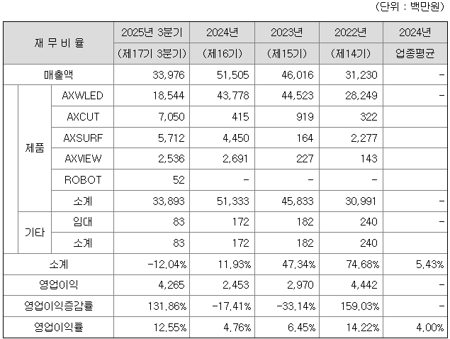 액스비스의 부채비율은 고정비 비중이 높은 레이저용접장비 산업의 특성상 대규모 설비투자 및 외주 차입이 빈번하게 발생함에 따비교적 높은 구조를 보이고 있습니다. 동사의 차입금 의존도는 2022년 30.90%에서 2025년 3분기 기준 40.76%로 상승하였습니다. 이는 생산설비 및 고정자산 투자 확대에 따라 외부차입 조달이 확대된 결과이며, 회사는 2026년 이후에 신규 매출 창출과 더불어 현금흐름 기반의 안정화로 점진적 개선을 전망하고 있습니다.