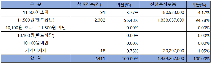 수요예측 참여 건수는 총 2,411건에 신청 주식수 1,939,267,000주로, 참여 경쟁률 1,124.21 : 1의 실적을 기록했습니다.