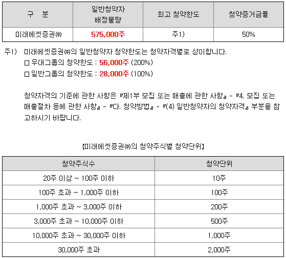 미래에셋증권의 일반 청약자 배정 물량은 575,000주이고, 일반 청약자의 최고 청약 한도는 일반그룹 기준 28,000주입니다.