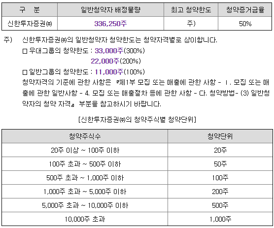 신한투자증권의 일반 청약자 배정 물량은 336,250주이고, 일반 청약자의 최고 청약 한도는 일반그룹 기준 11,000주입니다.