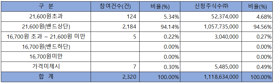수요예측 참여 건수는 총 2,320건에 신청 주식수 1,118,634,000주로, 참여 경쟁률 1,108.93 :1의 실적을 기록했습니다.