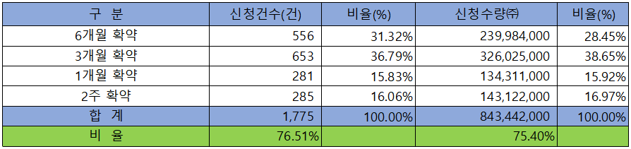 의무 보유 확약 건수는 1,775건에 843,442,000주로 전체 신청 물량 대비 건수로는 76.51%, 수량으로는 75.40%였으며, 3개월 확약 비중이 제일 높았고, 그 뒤를 6개월 확약과 2주 확약이 잇는 등 고른 분포를 보여주고 있습니다.