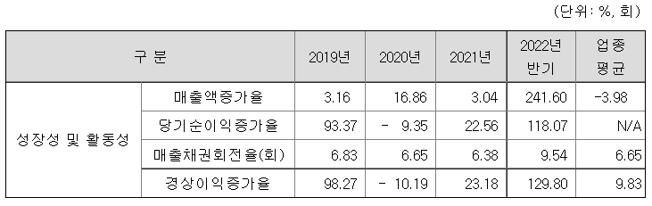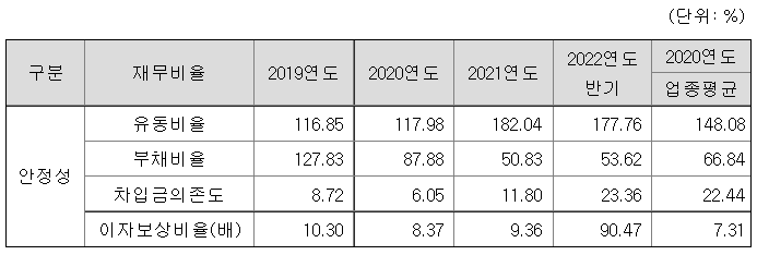 동사의 유동비율과 이자보상비율은 업종 평균 대비 높은 수준이고, 2022년 반기 기준 부채비율이나 차입금의존도 업종 평균보다 낮은 수준을 유지하고 있습니다.
