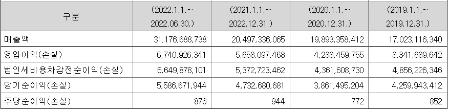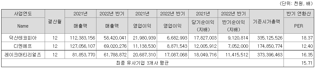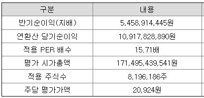 회사의 주당 평가가액은 2022년 상반기 순이익을 바탕으로 주당 순이익을 구한 다음 유사 회사의 평균 PER를 적용하여 산출한 것입니다.