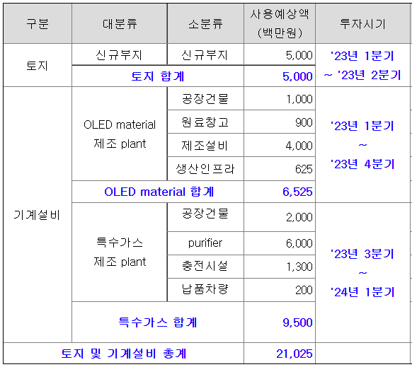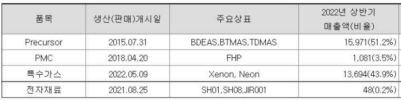 반도체 프리커서는 반도체 소자간 절연막, 반도체 소자내 전자 이동막, 디스플레이 패널의 수분과 산소 침투 방지제 역할을 수행하는 제품이고, 포토마스크 케이스는 포토마스크의 공정간 이동중 결함을 최소화하고 제어할 수 있는 제품이며, OLED 유기 재료는 OLED TV, OLED조명 등에 사용되고 있고, 반도체용 특수가스는 홀 에칭 공정 등에 사용됩니다.