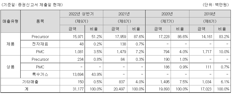 제품중에는 프리커서 제품의 판매가 제일 높은 비중을 차지하고 있습니다.
