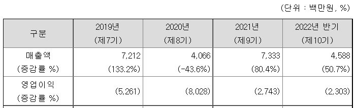 뉴로메카의 매출은 2019년 72억원 에서 2020년 코로나로 인한 매출 감소 기간을 지나 2021년 매출 수준을 회복하였고, 2022년 반기 현재 46억원의 반기 매출을 기록하였습니다.